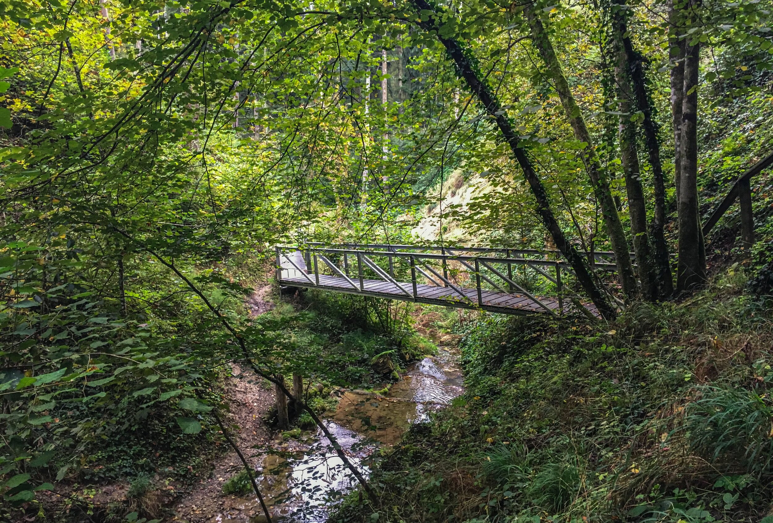 über schmale Fusswege und Treppen ist das Tobel erschlossen. Der dicht-bewaldete Weg führt dem Dickibach entlang.